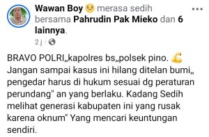 Facebook Wawan Boy memberikan Apresiasi kepada Polsek Pino Dalam Operasi Razia tersebut karena Petugas Kepolisian Berhasil menghentikan satu unit Toyota Alphard dengan nomor polisi B 2788 SXL yang membawa Ratusan Minuman Keras (Miras) dan Facebook Wawan Boy mengatakan Jangan Kasus tersebut hilang di telan bumi, agar Pelaku di Hukum sesuai dengan Peraturan Perundang-undangan.