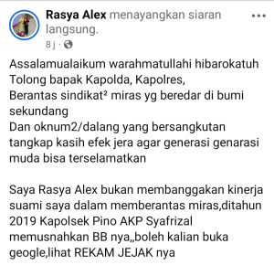 Facebook Rasya Alex dan juga sebagai istri Bhayangkari Polisi meminta kepada Kapolda, Kapolres untuk memberantas Sindikat Penjualan Minuman Keras (Miras) di Kabupaten Bengkulu Selatan agar Generasi Muda Bisa terselamatkan dari Minuman Keras (Miras).